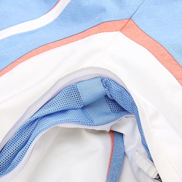 有些沖鋒衣的面料整體如同單層面料,銀灰色為通常的里料顏色,里料連接部位還能看到壓膠條。另外一種沖鋒衣是由獨立的兩個分層材料縫制而成,外表層面料是通過把具有防水功能且透氣性良好材料制成有特殊保護的織物組織結構。此類外表面料的外層起防水透氣作用,內層主要起排汗作用。里料層是另一層獨立的織物,里料和面料是可分開的,里料色彩一般為暗色,主要由錦綸材料、棉纖維之類吸汗材料制成,結構主要以網格為主,面料的拼合部位的壓膠通常會被里料遮蓋住,只有網格結構的里料才能看到壓膠處。