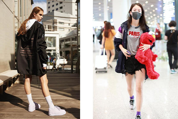 這是滿常見的一款,但同時也是最具風格性的。在普通的穿搭,只要套上透明雨衣式的沖鋒衣,都可以化腐朽為神奇!利用內搭上衣來避免撞衣的窘境,如圖左整套式的透明搭配,以頭跟腳的黑色配件來強化對比;圖右則是在亮橘色的衛衣外,罩上透明黑邊的沖鋒衣,點亮了原本較單調的穿搭;圖中的下身選擇簡單的五分短褲,加以凸顯上半身的半透明沖鋒衣之特色。
